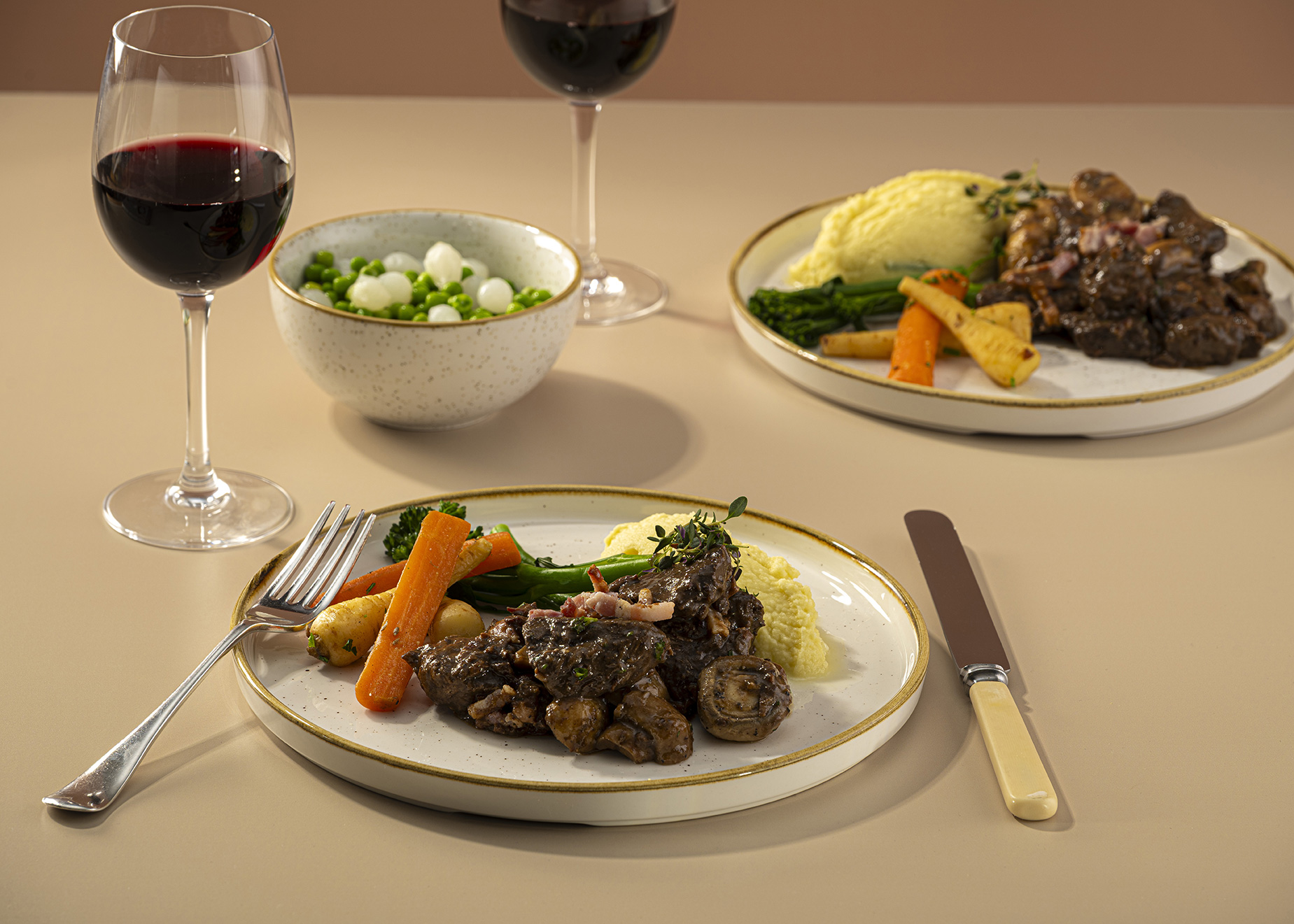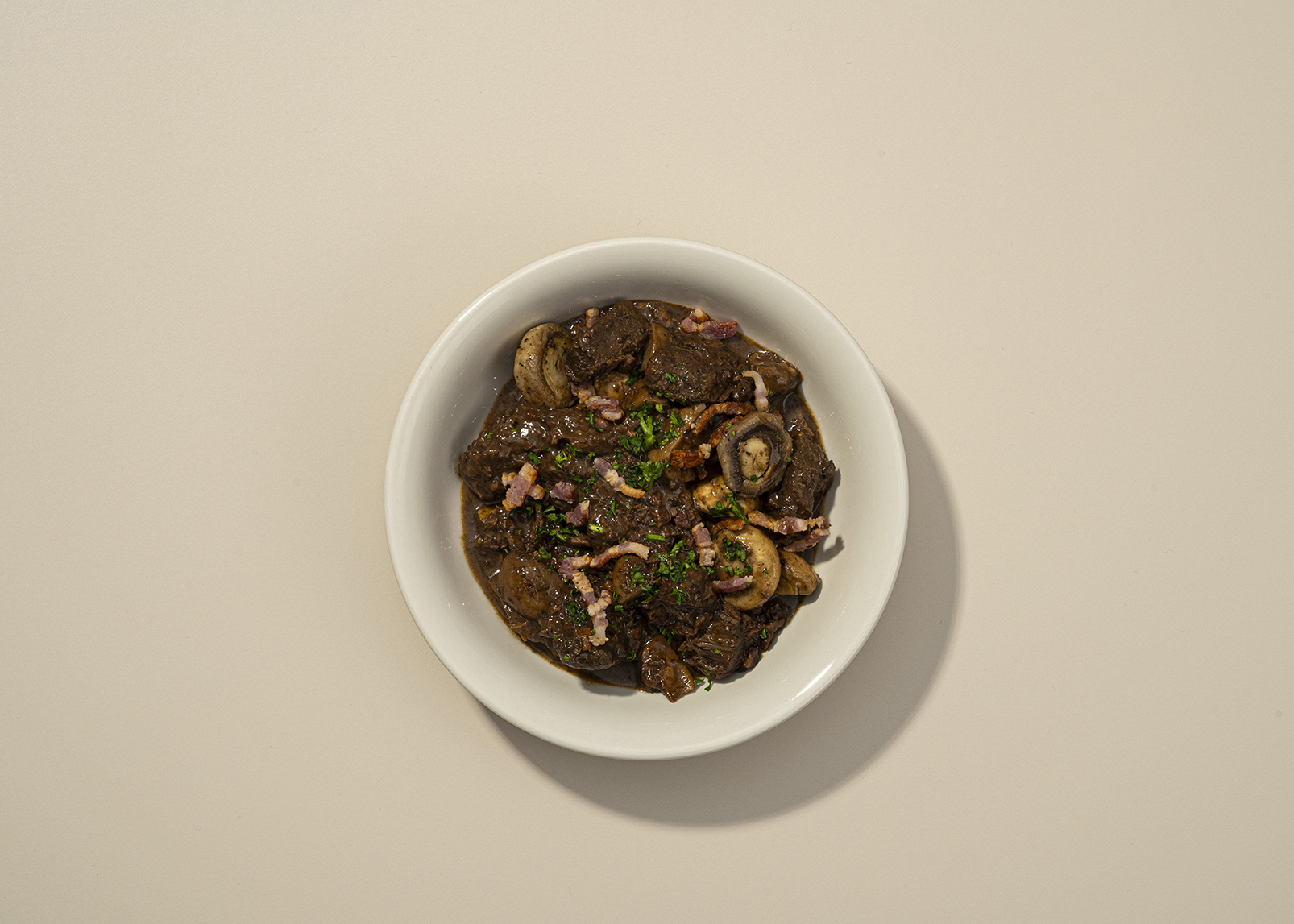 Tender choice cuts of beef slow cooked in red wine with mushrooms, shallots, bacon, garlic and garden herbs.